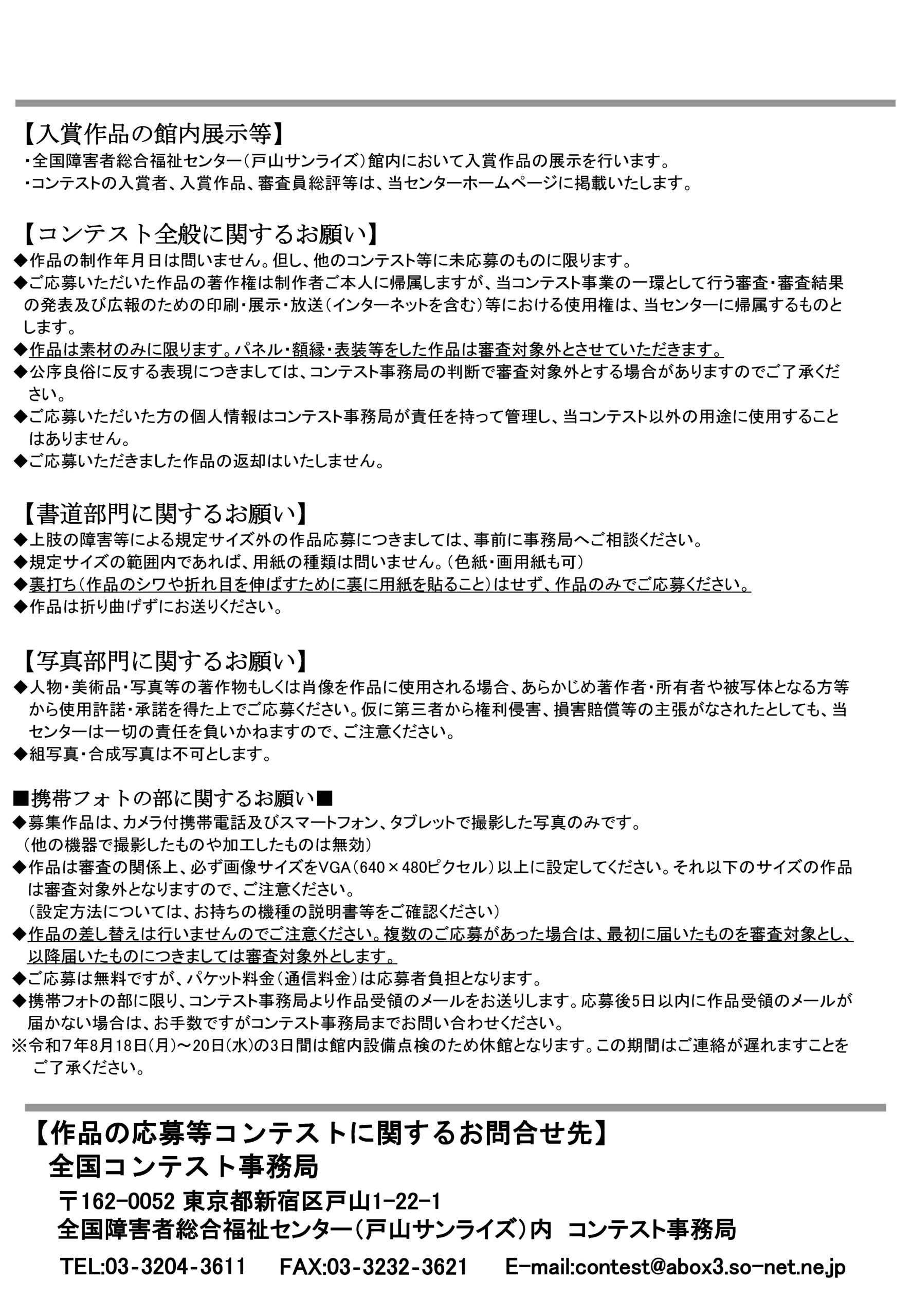 「障害者による書道・写真全国コンテスト」は、1981年の国際障害者年に掲げられた「障害者の完全参加と平等」をスローガンとして、1984年に設置された全国障害者総合福祉センター(戸山サンライズ)が主催しています。