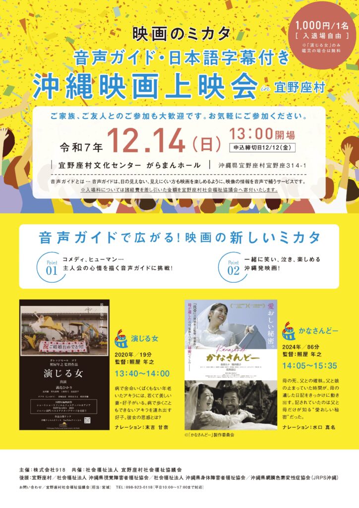 音声ガイドと日本語字幕付きで沖縄映画を上映し、視覚や聴覚にハンディキャップのある人もみんなと同じ空間で一緒に笑いや感動を共有できるイベント。