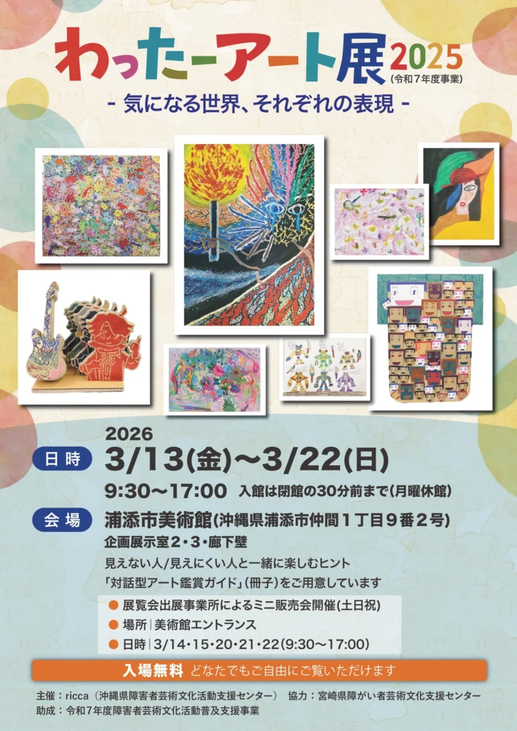 | 【主催・お問い合わせ】 | 沖縄県障害者芸術文化活動支援センターricca/りっか TEL : 098-996-4466 MAIL : info@riccart.jp |