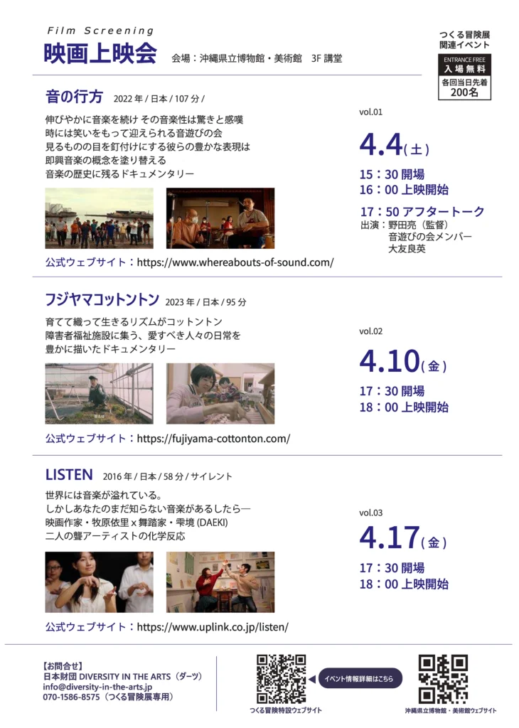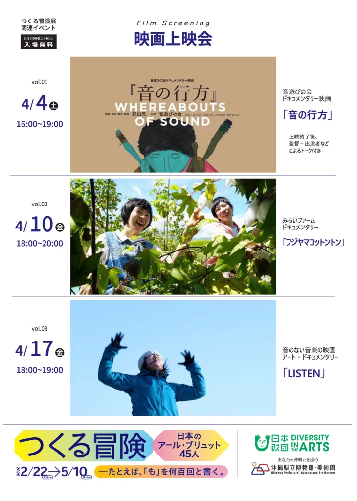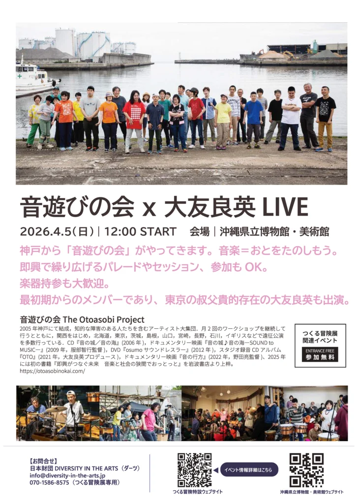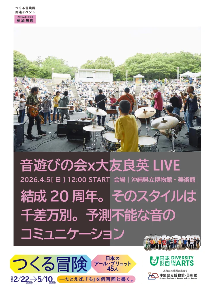 ◼︎会場 沖縄県立博物館・美術館(おきみゅー) 〒900-0006 沖縄県那覇市おもろまち3丁目1番1号 ◼︎スケジュール・詳細 ① 2026年4月4日(土) 映画上映「音の行方」+アフタートーク 時間: 開場15:30 / 上映16:00~17:40 / アフタートーク17:50~18:30 場所: 3F 講堂 内容: 映画「音の行方」《バリアフリー字幕・視覚表現版》上映(監督・撮影・編集:野田亮)。上映後、野田亮氏、音遊びの会メンバー、大友良英氏によるアフタートークを実施します。 定員: 200名(先着順・申込不要) 料金: 入場無料 ② 2026年4月5日(日) ライブパフォーマンス「音遊びの会 × 大友良英」 時間: 12:00~14:00 場所: エントランスホール 出演: 音遊びの会、大友良英 内容: 結成20周年を迎える神戸の「音遊びの会」と音楽家・大友良英氏による即興ライブ。即興パレードやセッションへの参加、楽器の持参も大歓迎です。 料金: 参加無料 ◼︎参考URL https://otoasobinokai.com/event/3797 チラシPDF▶︎![]()